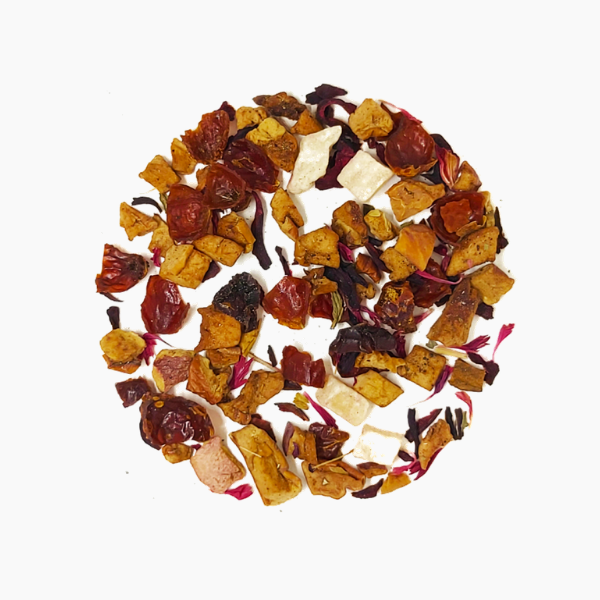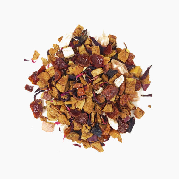 A vibrant blend of fruity apple, hibiscus, and tropical papaya with floral notes, creating a refreshing and exotic tea.